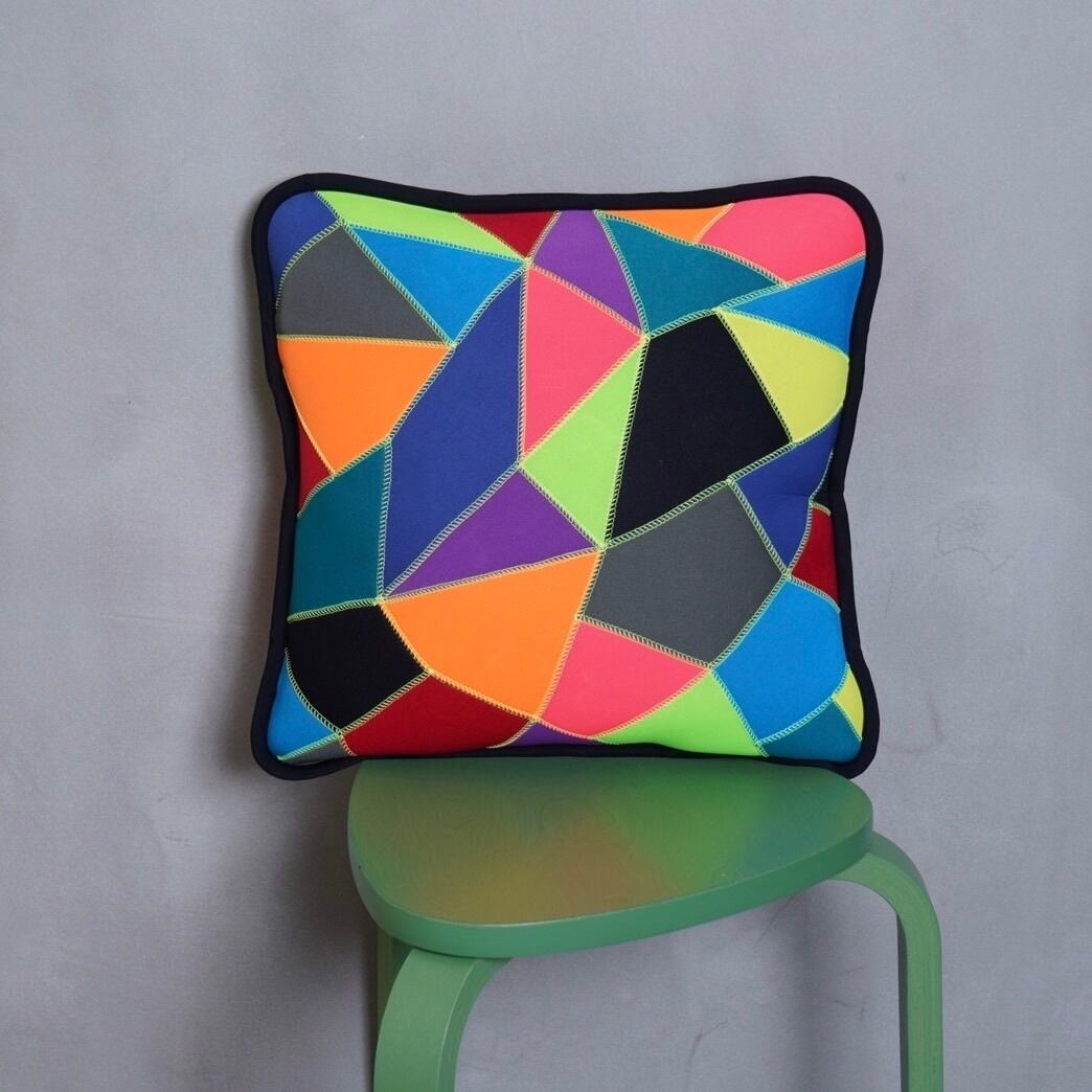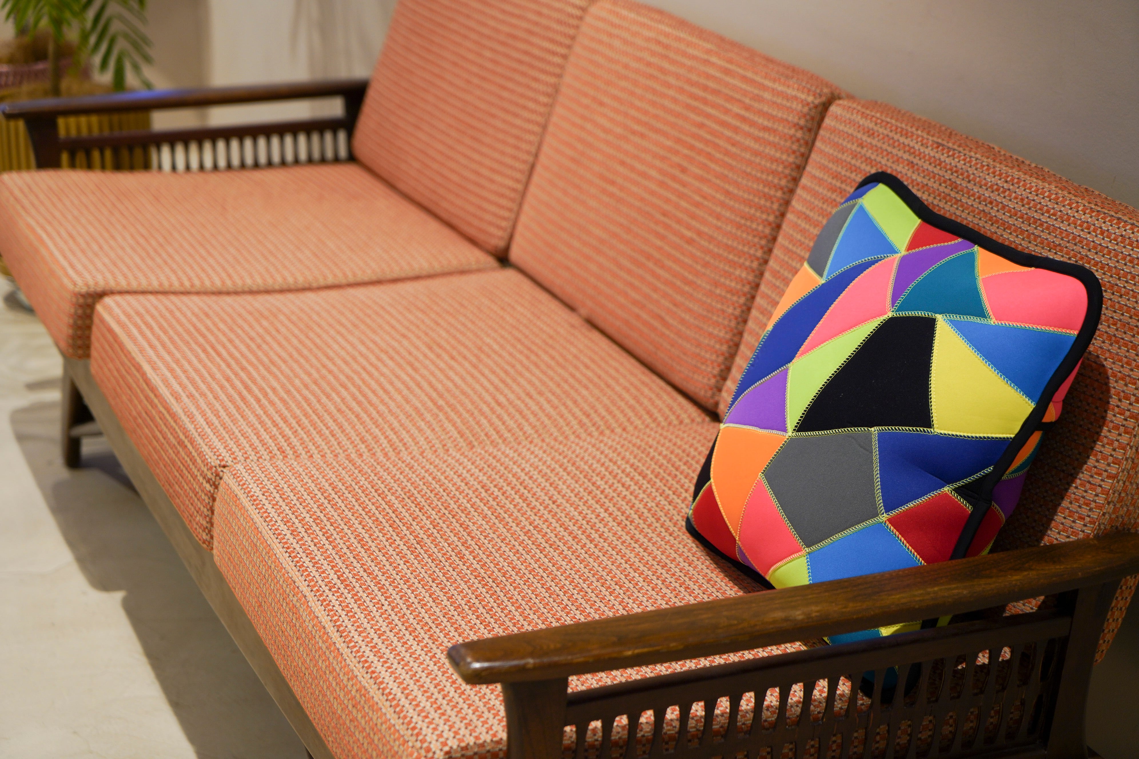 ウェットスーツ制作する際に出た切れ端(ゴミ)を再利用し、パッチワークにてクッションカバーを制作。アソートならではのオンリーワン作品。数量限定。